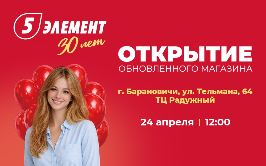 Мы возвращаемся! Уже 24 апреля в 12:00 в Барановичах откроется обновленный магазин «5 элемент»! Ждем гостей на праздник по адресу: ул. Тельмана, 64, ТЦ «Радужный». В программе — праздничное открытие с ведущим, розыгрышами и специальными акциями, которые будут действовать только с 24 по 26 апреля, а также главным розыгрышем мероприятия.