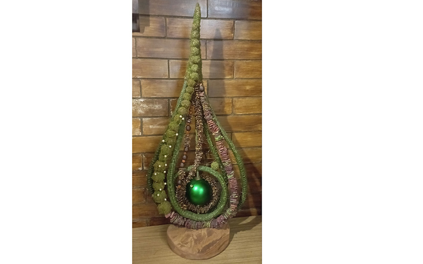Номинация «Эко-елка» подразумевает максимально широкое использование природных материалов. «Изначально возникла идея капли, в виде скрипичного ключа, – делится автор. – За основу взят материал ракитник, растущий в нашем лесу. Из него был скручен первый внутренний завиток».