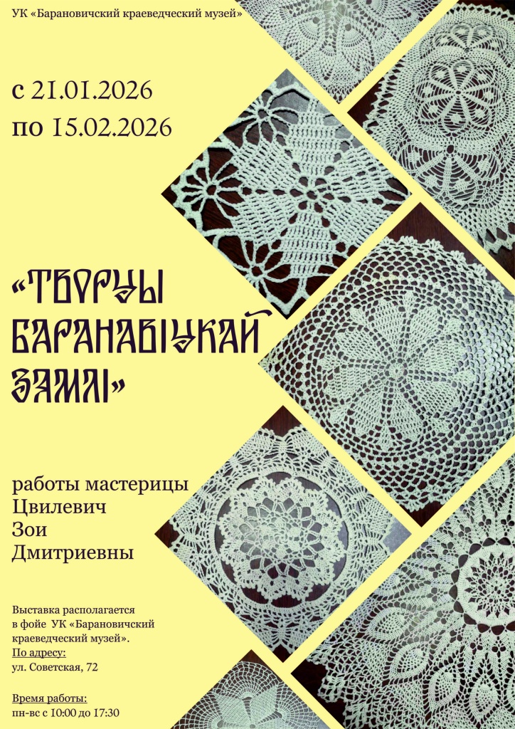 В Барановичском краеведческом музее стартовала первая в этом году выставка из цикла «Творцы Баранавіцкай зямлі». Ее героиней стала Зоя Цвилевич, мастер вязания крючком и руководитель Гирмантовского сельского дома культуры.