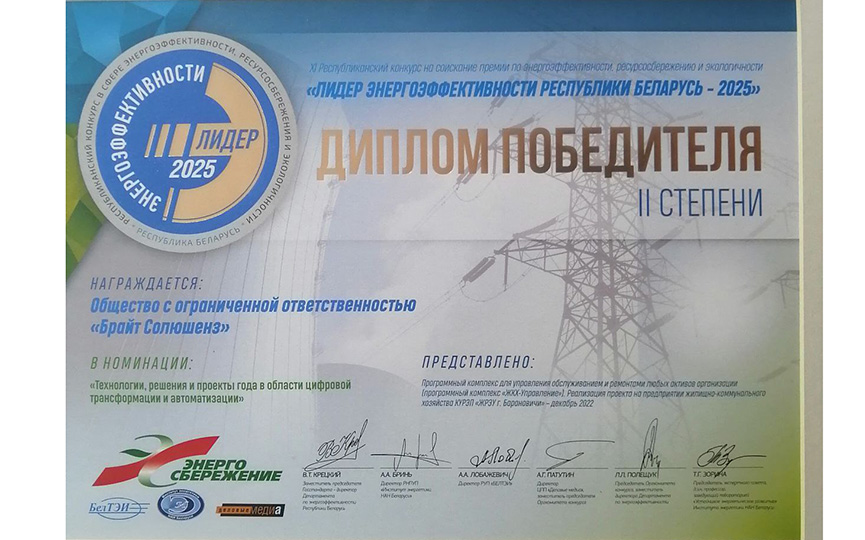 В номинации «Технологии решения и проекты года в области цифровой трансформации и автоматизации» общество с ограниченной ответственностью «Брайт Солюшенз» удостоено диплома II степени. На конкурс был представлен проект – программный комплекс «ЖКХ – Управление», реализация которого осуществлялась на базе ЖРЭУ города Барановичи.