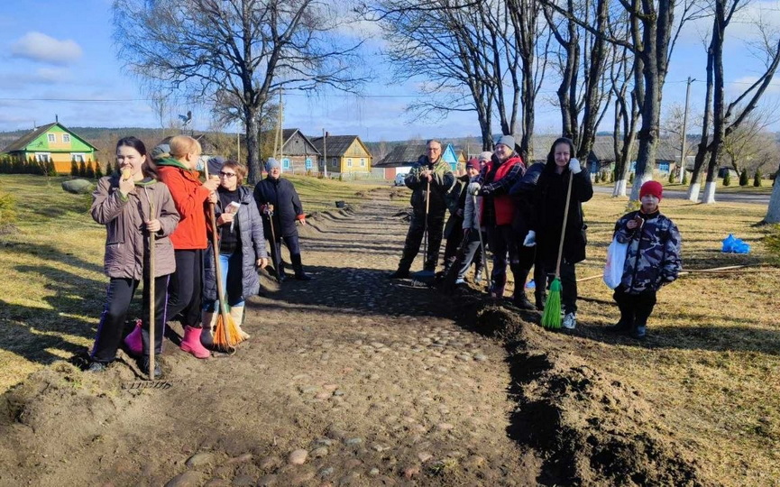 В деревне Молчадь работники сельисполкома совместно с активными жителями деревни потрудились на очистке старинной брусчатки.