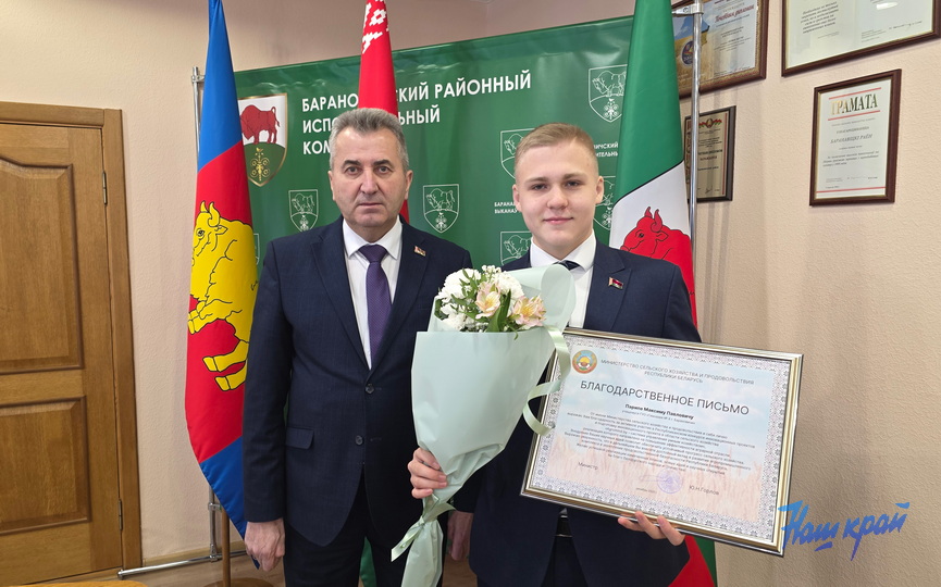 За проект молодой новатор был удостоен Благодарственного письма министра сельского хозяйства и продовольствия Юрия Горлова. Награду Максиму вручил заместитель председателя Барановичского райисполкома Михаил Борисевич.