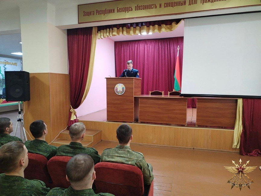С военнослужащими, проходящими срочную военную службу 85-й бригады связи, старший прокурор отдела прокуратуры Брестской области по надзору за исполнением законодательства в войсках, юрист первого класса Дмитрий Сацук провел беседу.