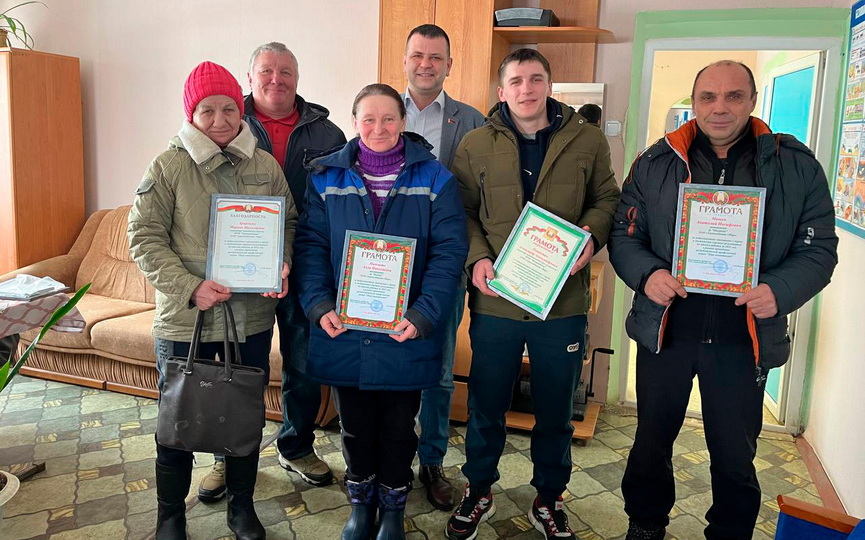 Чествовал передовиков животноводческих объектов также лидер первички агрокомбината «Мир» Олег Минич. Так, добросовестно относятся к работе, а также добились хороших результатов по итогам прошлого года операторы машинного доения: Юлия Турович, Марина Арцименя, Наталья Малявка, оператор животноводческих комплексов МТФ «Великое Село» Георгий Дорошевич, животноводы Наталья Щюкене, Ольга Бутрим, Алла Павкшто, Ольга Хилевич, Анатолий Мишук, Александр Пашкевич.