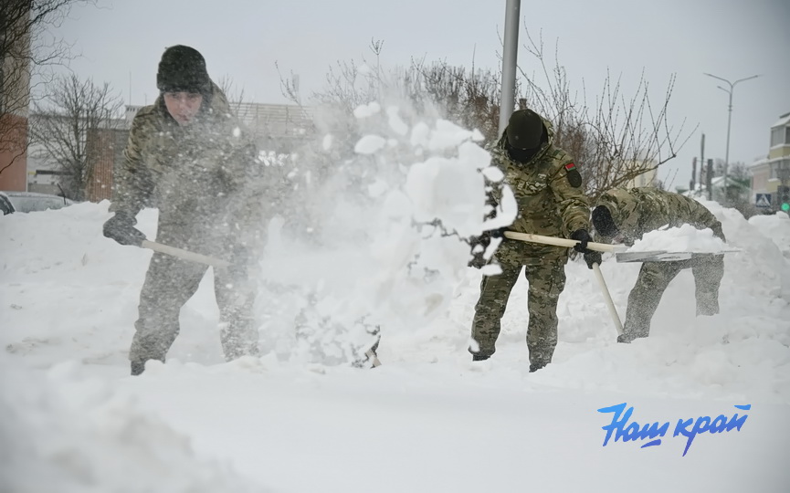 Снегопад, который обрушился на Беларусь, объединил всех. На улицы Барановичей вышли и военнослужащие войсковой части 7404.