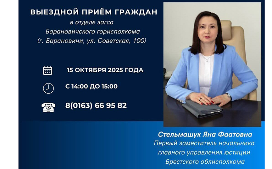 15 октября 2025 года с 14:00 до 15:00 проведет выездной прием первый заместитель начальника главного управления юстиции Брестского облисполкома Стельмашук Яна Фаатовна.