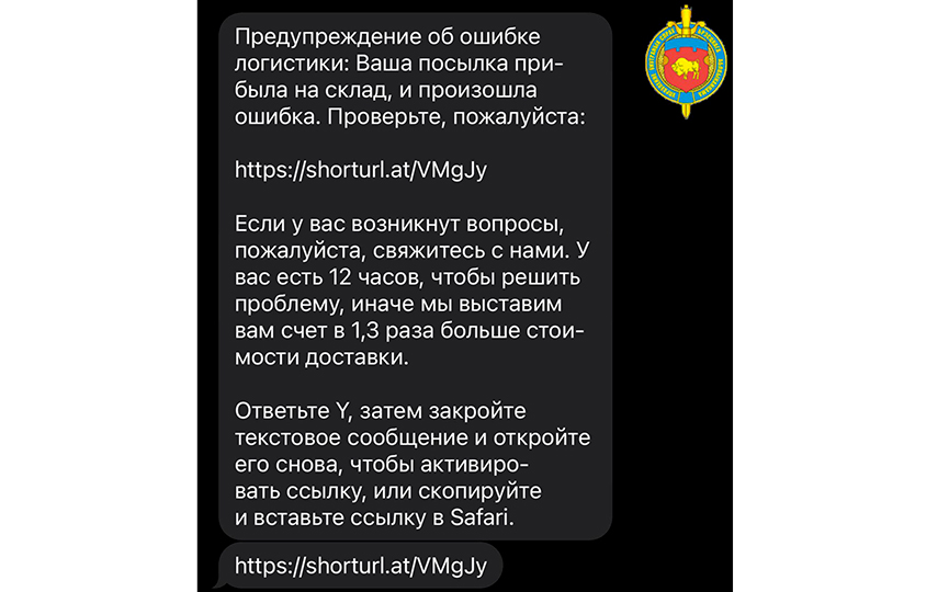 На номера белорусских абонентов поступают СМС-сообщения с иностранных номеров, которые выглядят так, как будто их отправила логистическая компания. В этих сообщениях мошенники утверждают: «Ваша посылка по ошибке вернулась на склад. У вас есть 12 часов, чтобы подтвердить доставку. В противном случае с вас будет списана сумма на 30% выше стоимости товара». В сообщении содержится ссылка на фишинговый сайт, где вам предлагают «срочно ввести свои данные», чтобы «уточнить доставку».