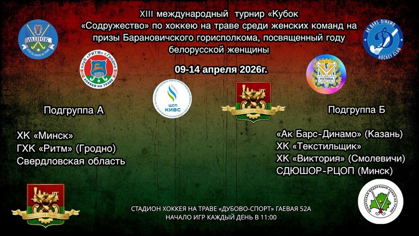 По доброй традиции, в Барановичах в очередной раз пройдут соревнования по хоккею на траве среди женских команд на призы Барановичского горисполкома – международный кубок «Содружество». В этом сезоне ХІІІ Кубок будет посвящен Году белорусской женщины.